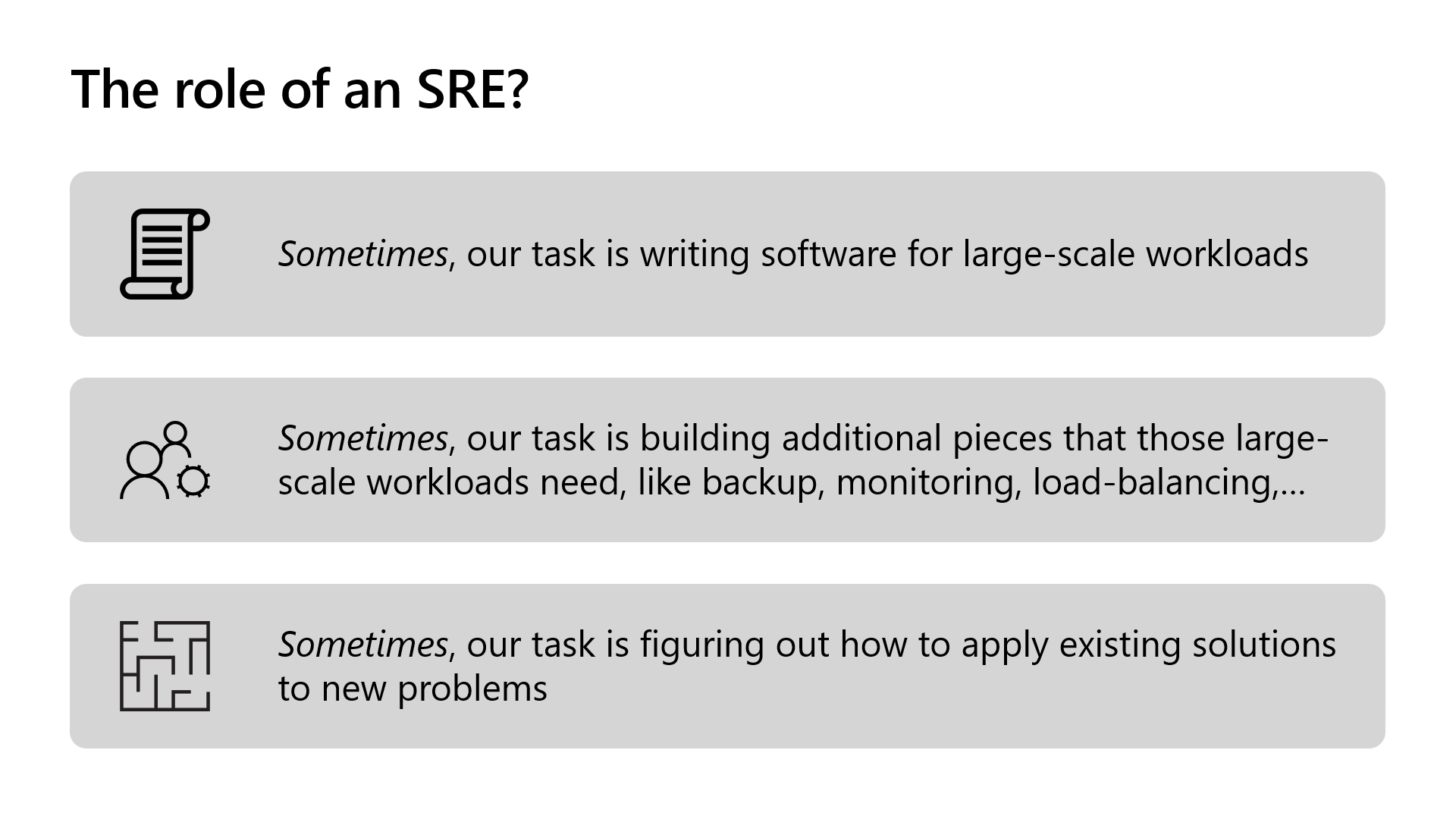 Drilling down on the role of an SRE would take me like a day or 2, but easy said, it can be 3 different core responsibilities:
