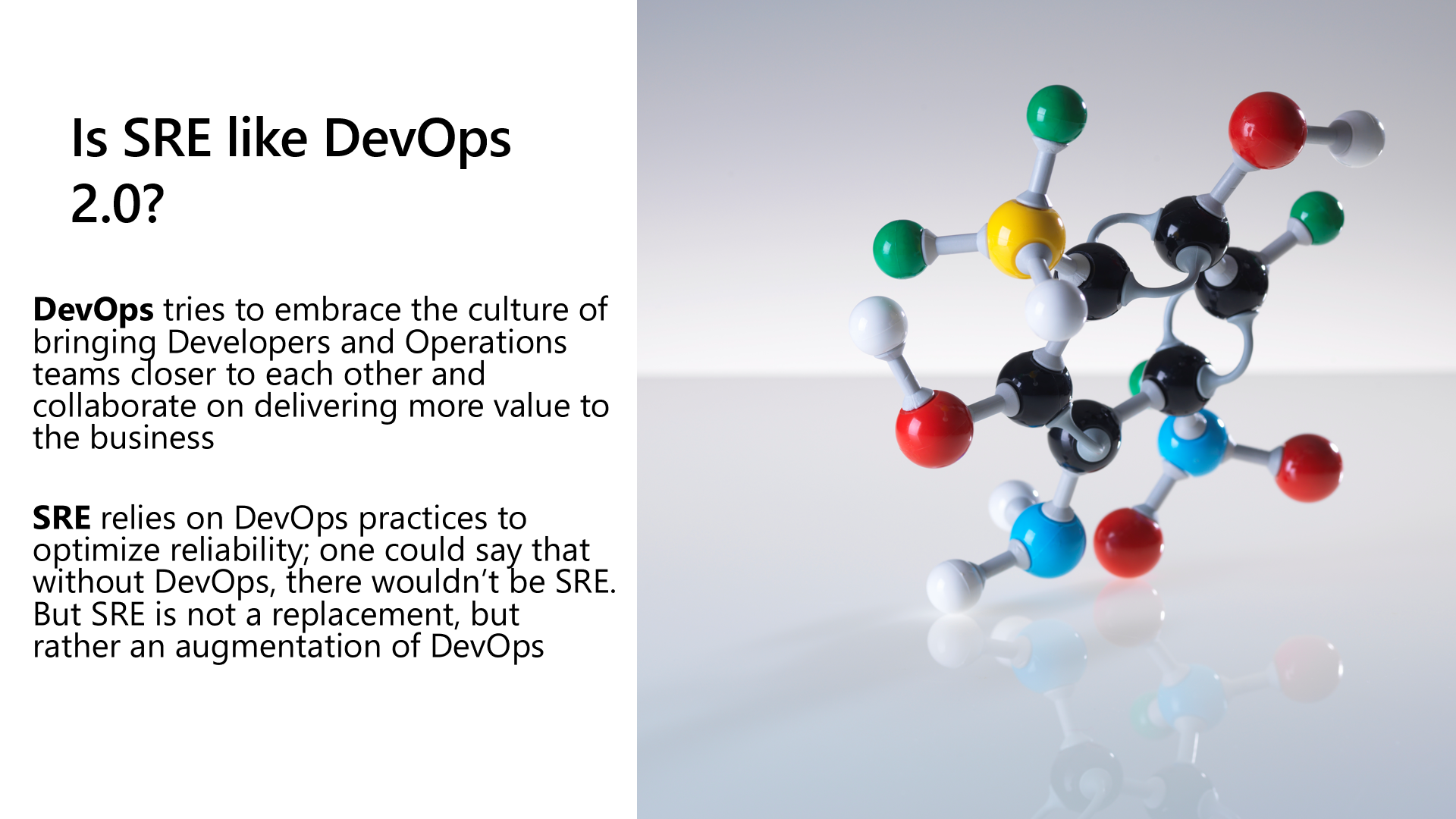 SRE relies on DevOps prpctices to optimize reliability – I’ll walk you through some demos on that later in this session with Azure DevOps; I always say there wouldn’t be SRE without DevOps; but SRE is not replacing DevOps, but is rather augmenting it.