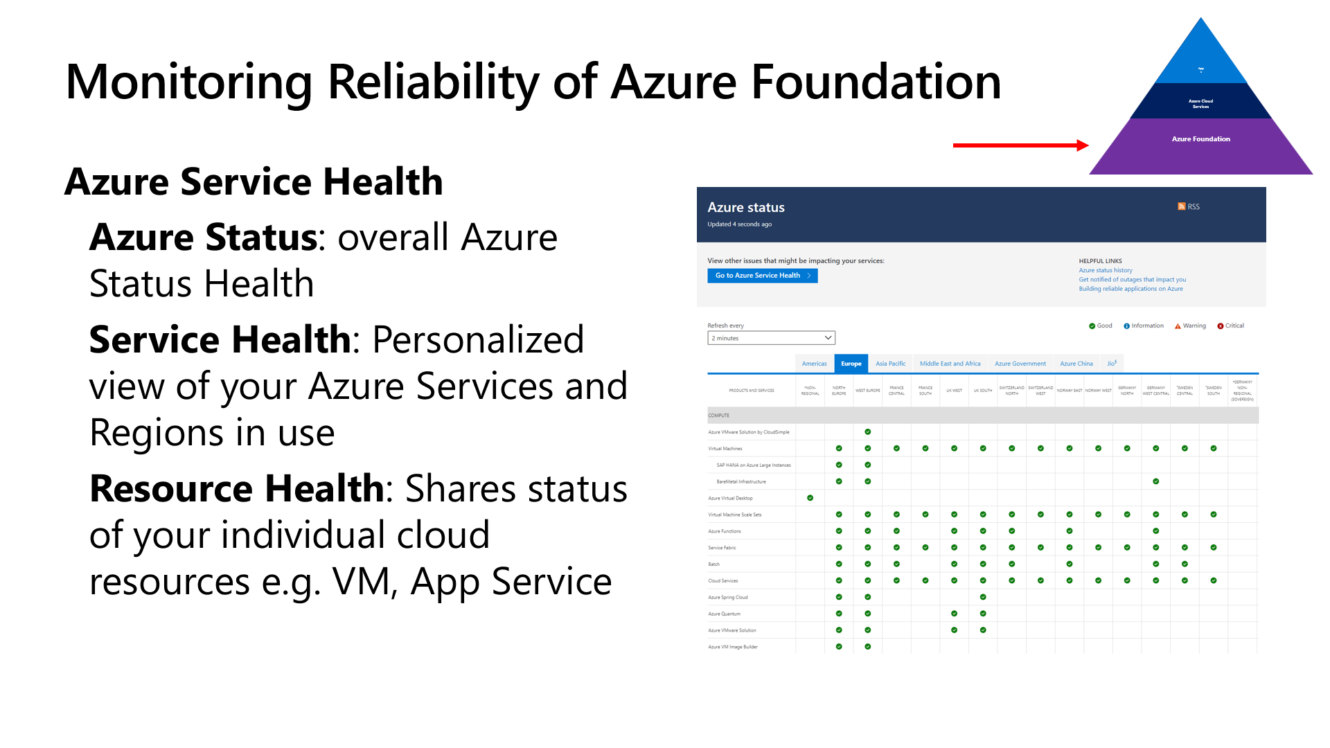 Resource Health: Shares status of your individual cloud resources e.g. VM, App Service