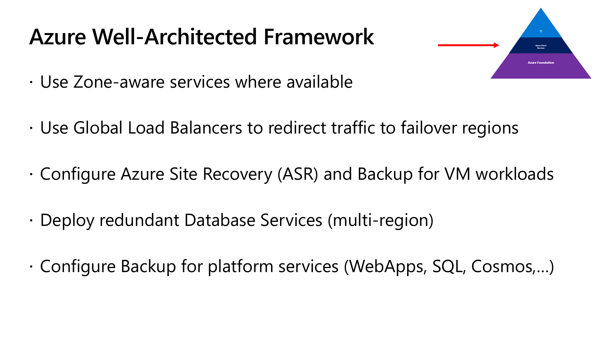 Important to emphasize is that using Azure is a shared responsibility; out of Microsoft, we need to provide a reliable Azure Foundation, think of the physical datacenters, allowing customers to build their level of reliability and resilience on the Cloud Services layer – think of Availability Sets and Zones for VMs, Global Load Balancers to redirect web traffic across Azure Regions or multi-region storage and database replication; which results in reliable App Runtimes