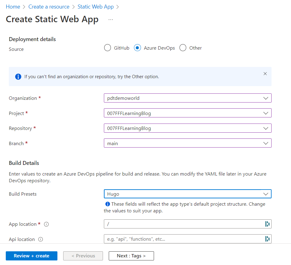 c) Next, provide the necessary deployment details. Notice SWA relies on a DevOps pipeline process, which can be GitHub or Azure DevOps. The pipeline basically gets triggered to compile the Hugo Markdown files (your blog article) into HTML-files, and gets triggered every time something is changed in the repository (like when you write a new blog post, delete a post or update a post…)