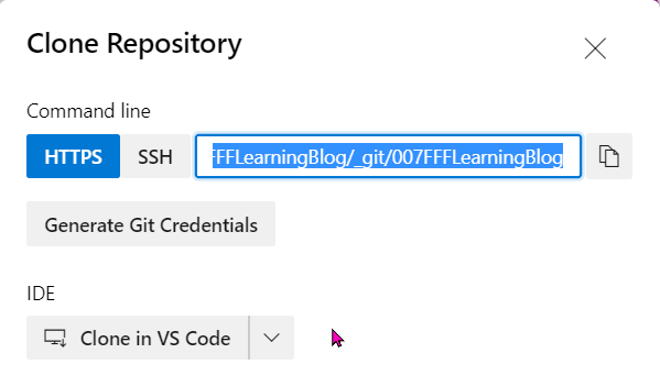 - From the DevOps environment, go to Repos (Github or Azure DevOps), and clone this repo to your local machine. I’m using Visual Studio Code, as it’s a brilliant MarkDown editor with Git integration out-of-the-box.