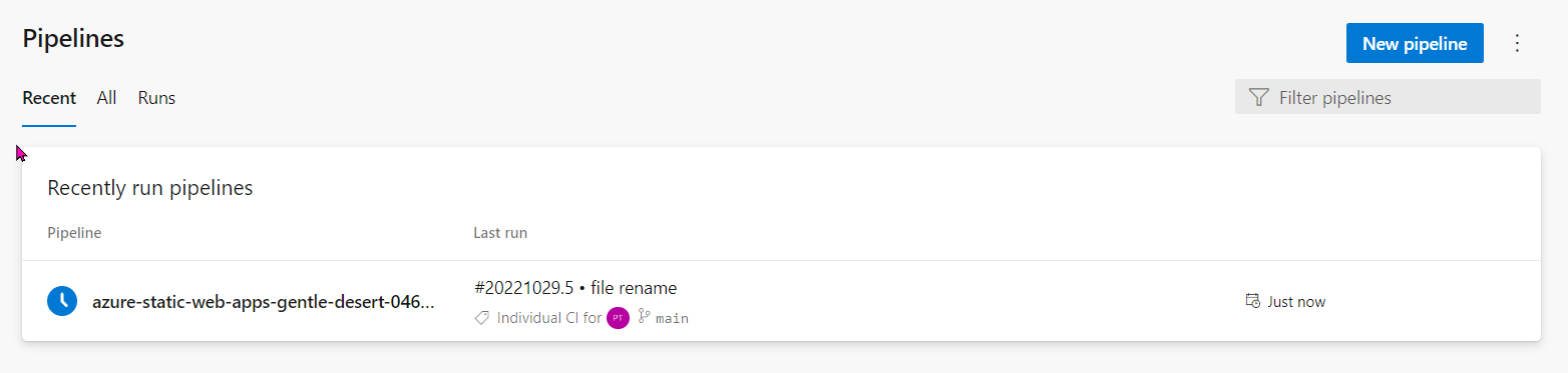 - Given the automatic trigger, the Pipeline will be picking up the change and executing a new run. Wait for this to complete successfully.