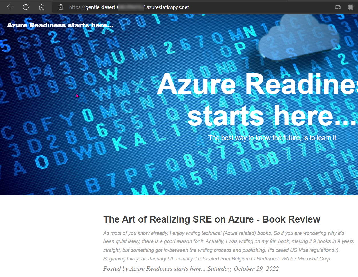 - Connect to the Azure Web App resource URL (something like https://gentle-desert-123456789.2.azurestaticapps.net/) as in my case, and behold your blog website is live!!