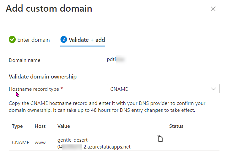- Add the custom domain name, and copy the CName record details over into your actual DNS hosting solution management portal. Once this is done, head back over to this Azure Custom Domain blade and confirm the domain validation. Note - depending on the DNS provider of use, this might take up to several hours. Mostly, this will only be a few minutes though.