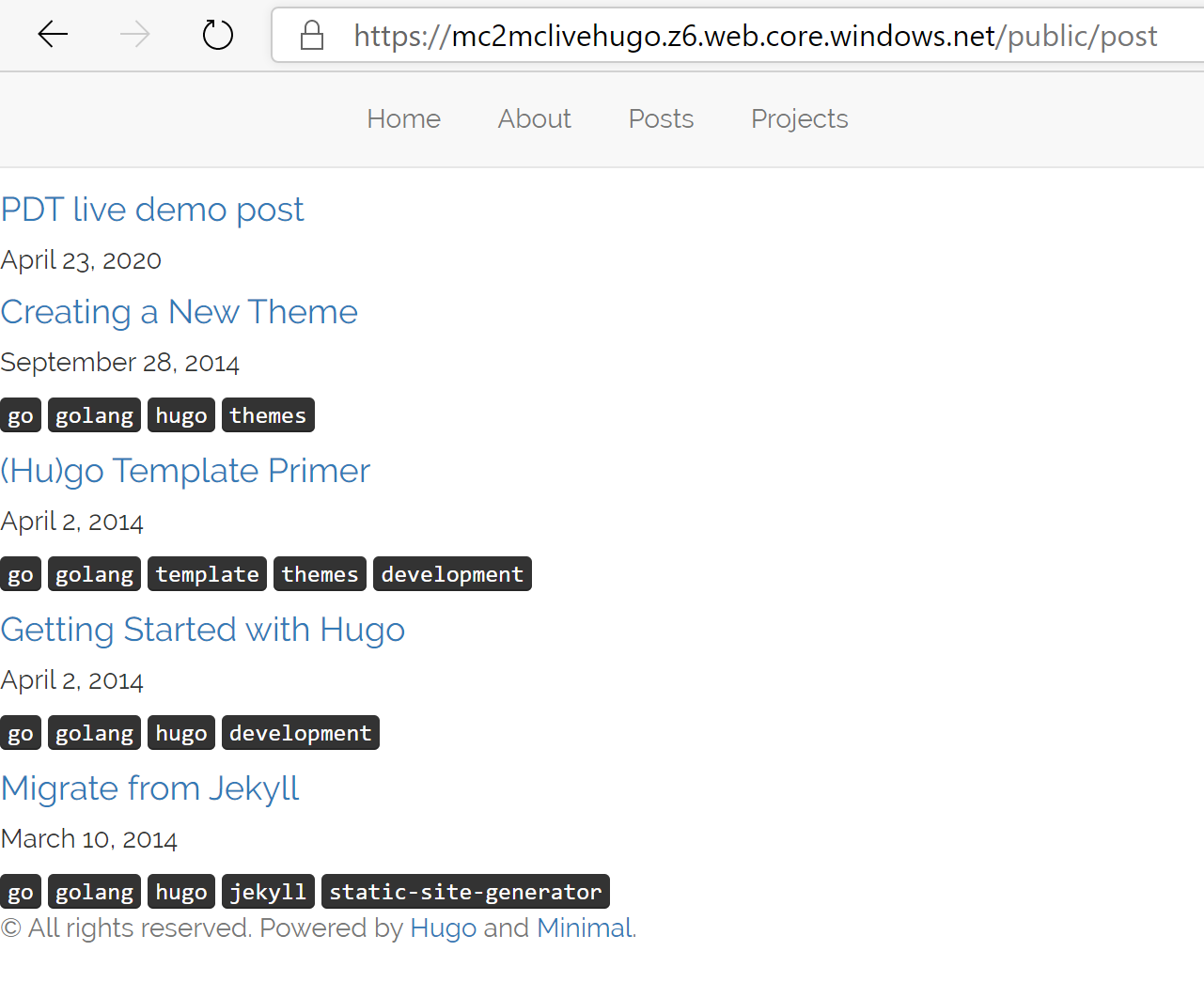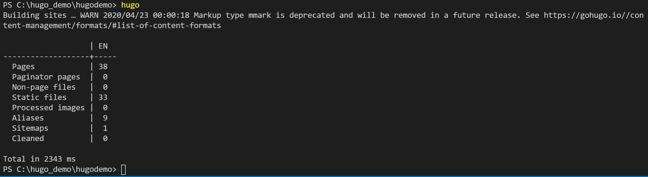 However, this is “only local†on our dev station; to prepare the site to get published to Azure, compile it by running “hugo†from the command prompt (instead of hugo server)