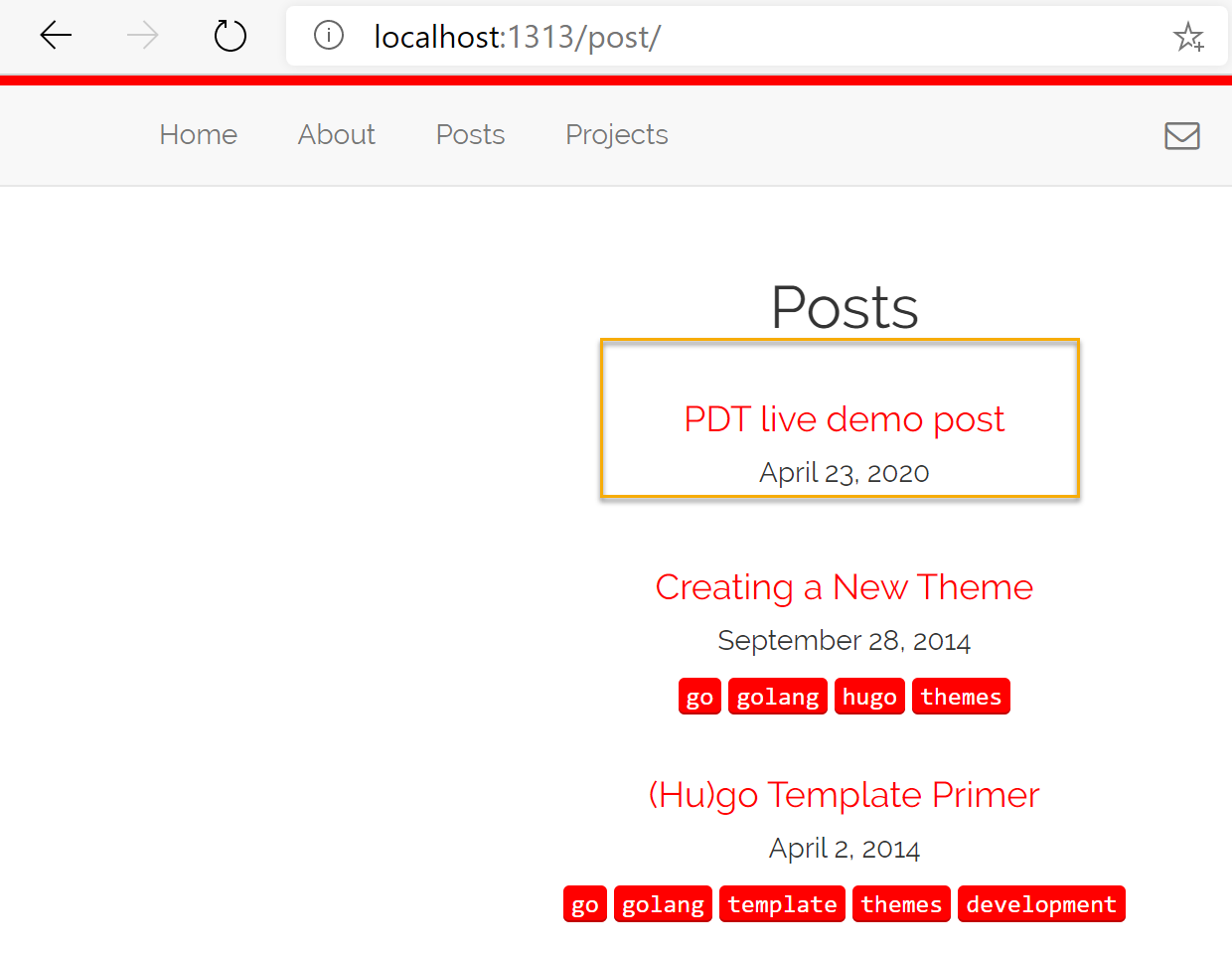 Once your new post has been created, open your terminal again, and run “Hugo Serverâ€. This will start a new web session. Validate from the browser on http://localhost:1313 if the new page is visible