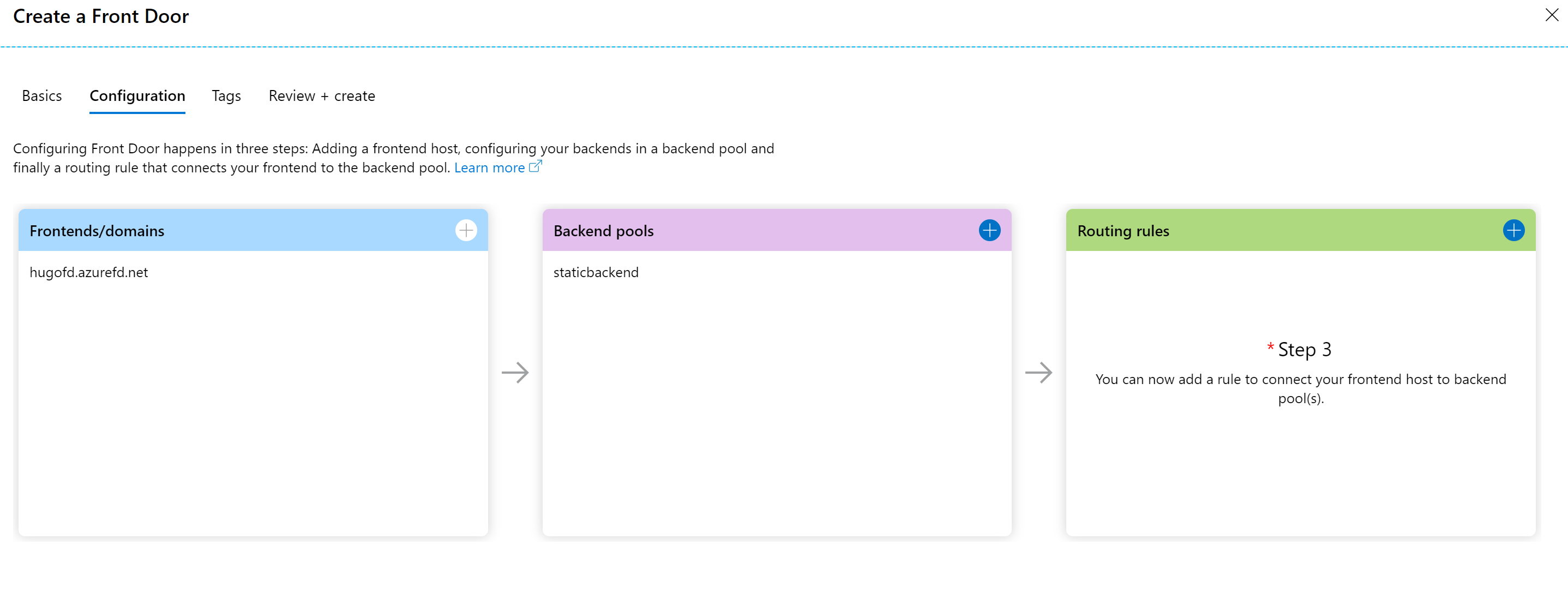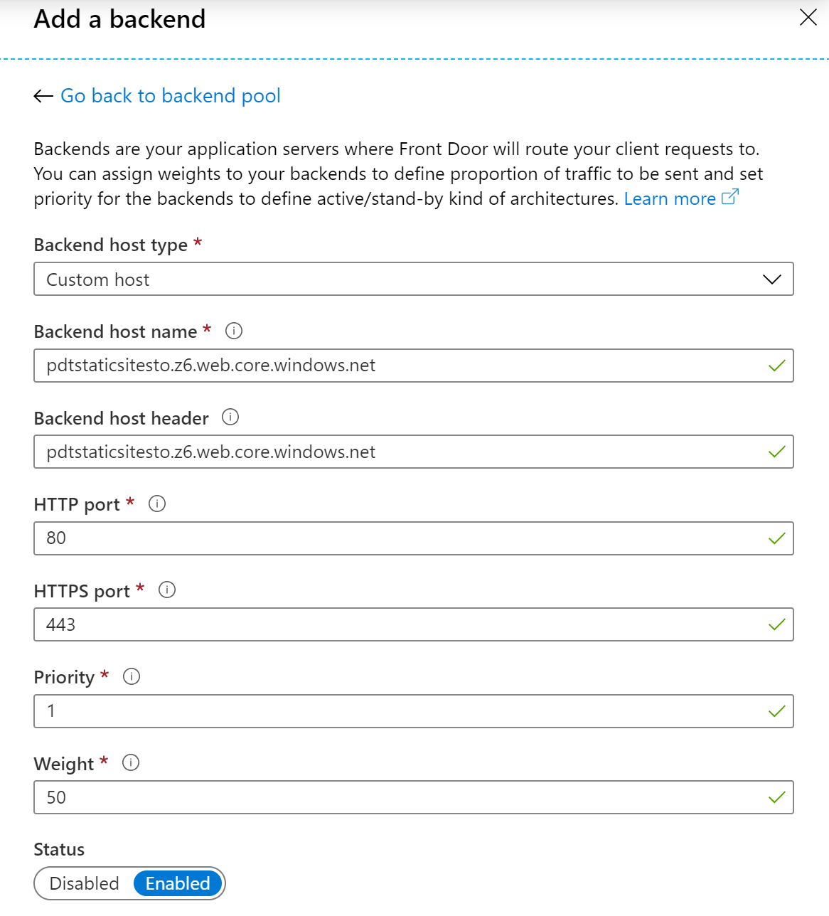 Continue with Step 2 where you define the backend pool settings. This is basically pointing Front Door to the Static Site Storage Account URL