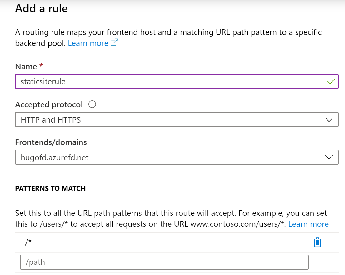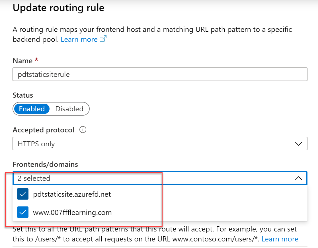 Once the custom domain is configured, we need to make one last change in our routing rules, adding the custom domain to the configuration. Therefore, select the routing rule you created earlier, and update its settings: