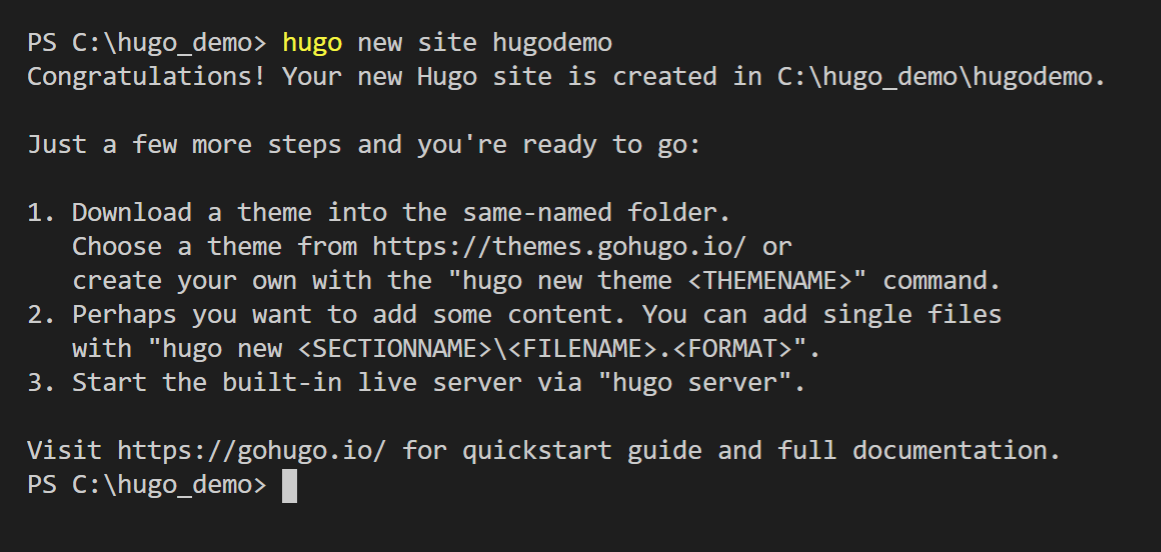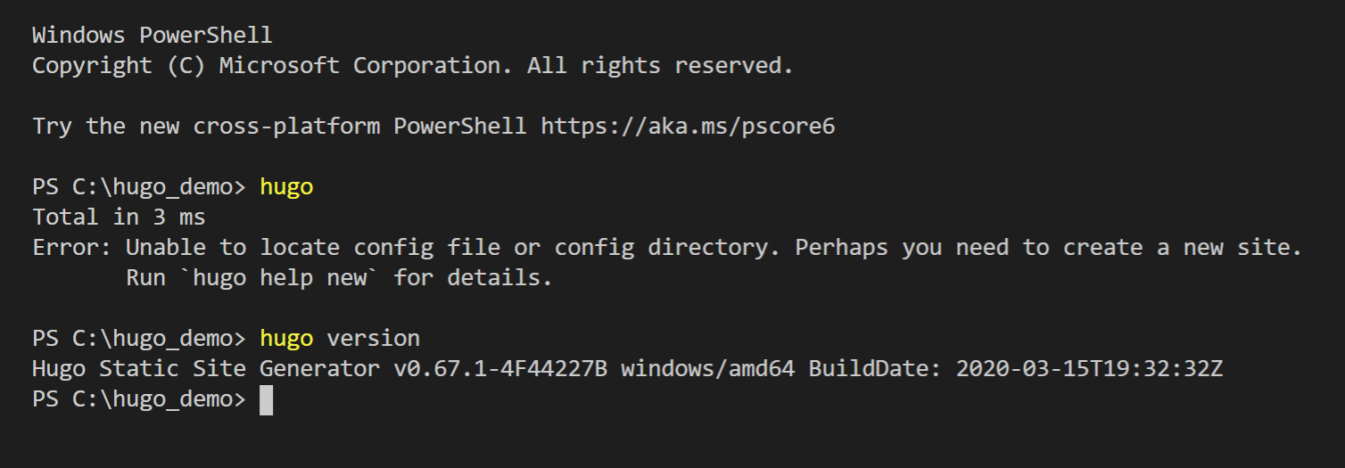 Install Hugo on your local machine, from http://gohugo.io (I’m running this on Windows 10, but it also supports Linux and MacOS)