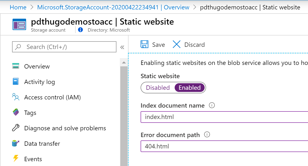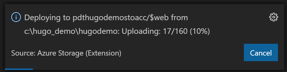 Complete the prompts with answers from your Azure subscription and setup, and select your Hugo folder as a source. This will copy all files from the /public/ subfolder into the Storage Account $web folder