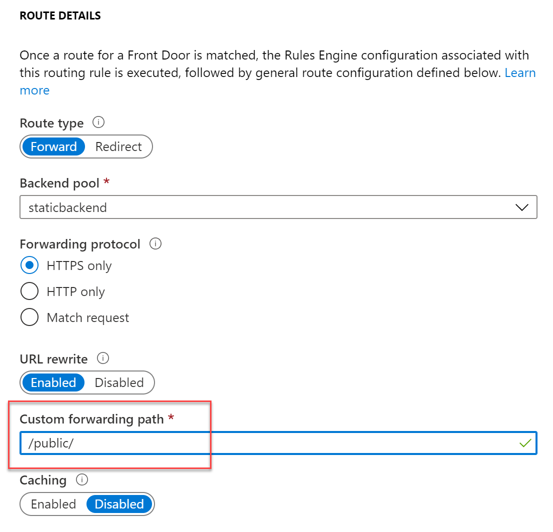 In the Route details section, scroll down and change the setting for Custom forwarding path, adding the “/public/ path that is used by Hugo (Note: this path could be different, depending on the Hugo Theme; this path technically refers to the directory that Hugo uses to store the compiled site pages.