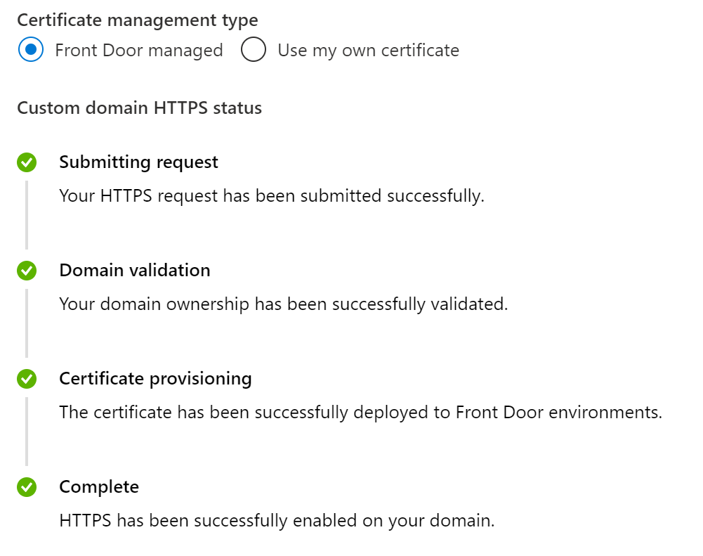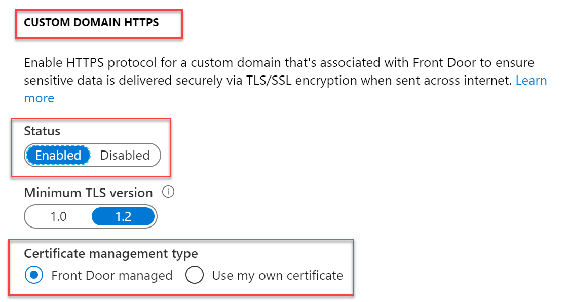 If you also want to add the Domain HTTPS option to the configuration, select this setting a bit more down in the blade. If you don’t have a PFX certificate file already for the public domain name space, have one generated by Front Door, by choosing Front Door managed.