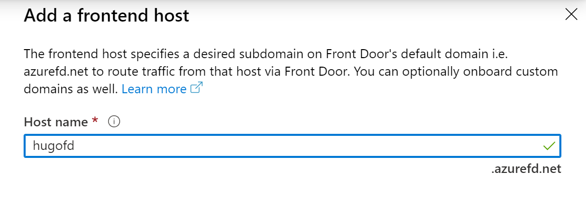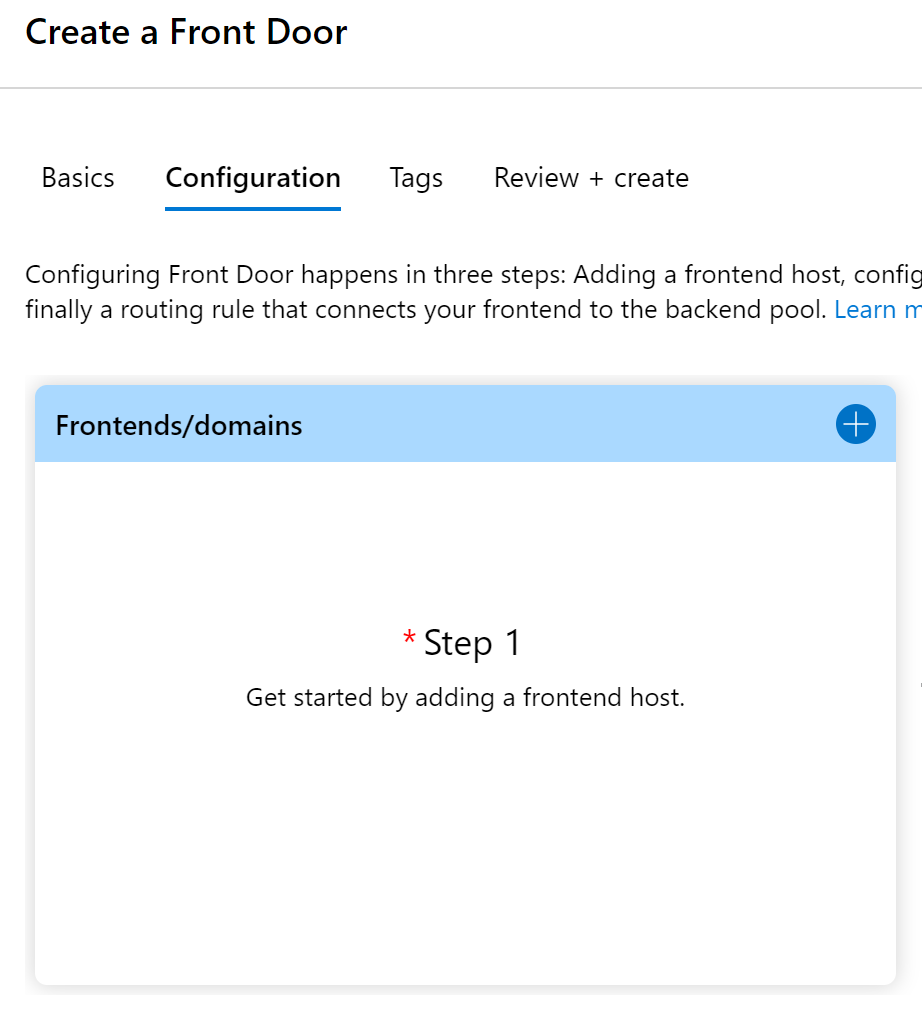 Click the + sign to add the Front Door Frontends/domains settings, and provide a unique name for the Front Door URL you want to use