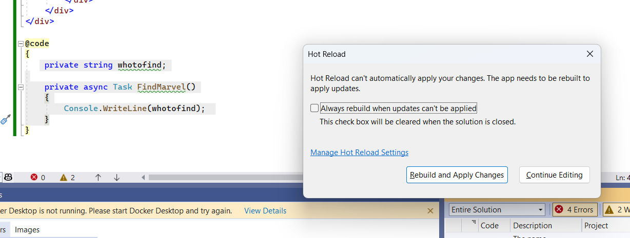 - Save the updates again; notice how Hot Reload is not able to refresh the changes just like that, since it is more than just a cosmetic change in HTML.