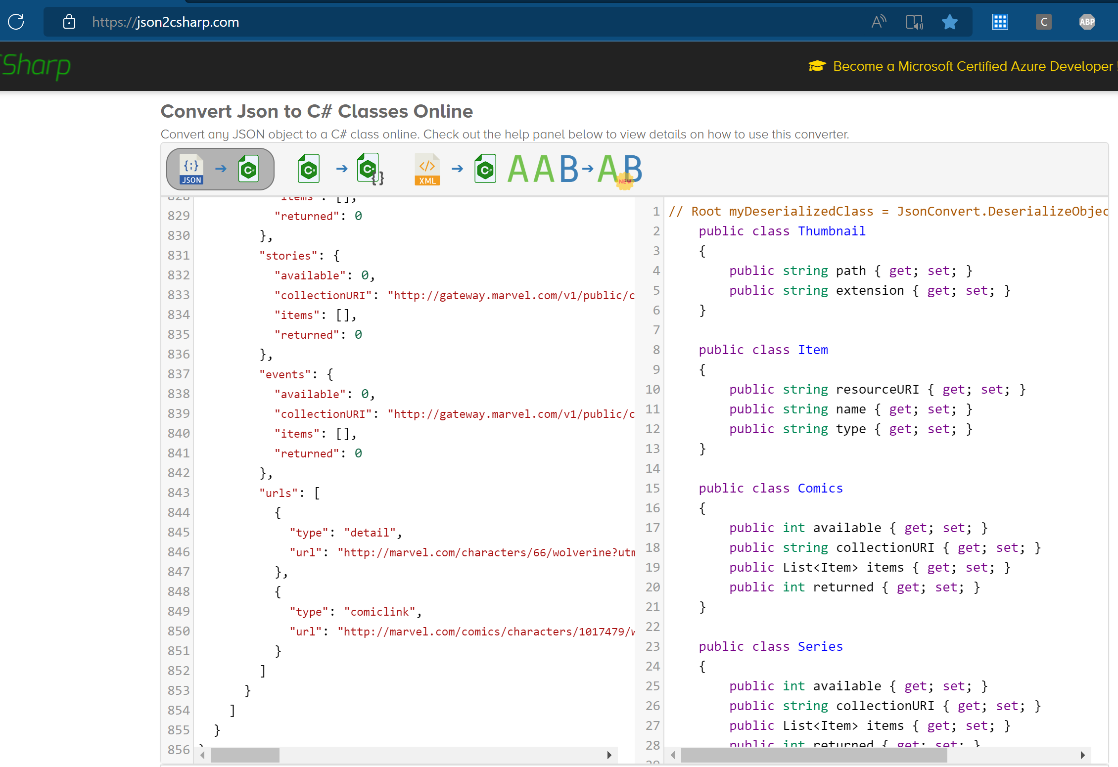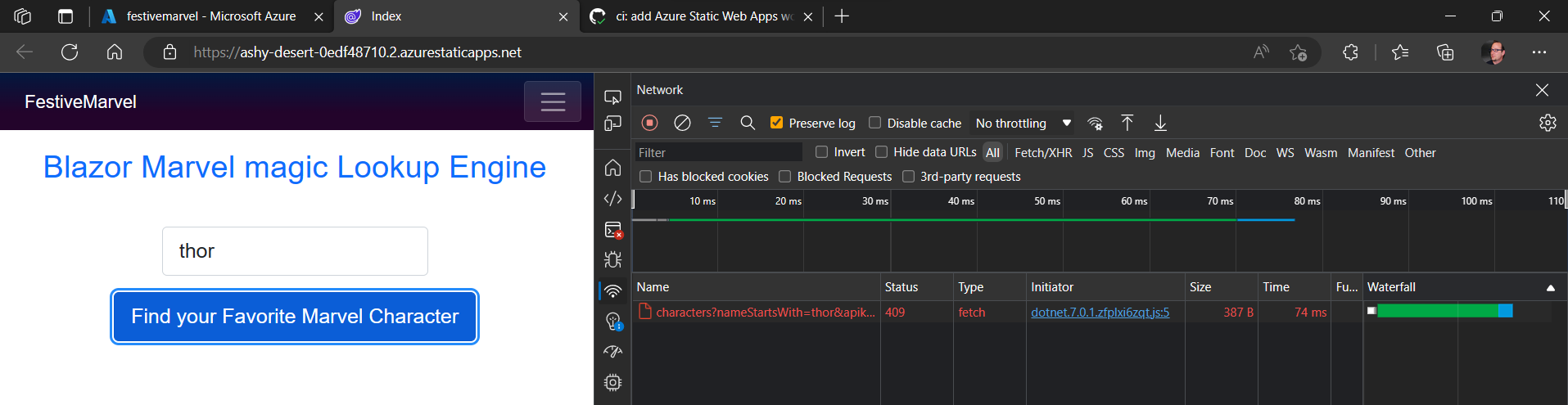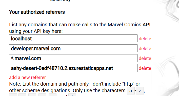 11. Remember at the start, where we configured the API calls at the Marvel Developer site, we needed to specify the source URLs from where the calls are allowed. This Azure Static Web App URL is not configured. (Hence why I didn’t worry too much about including my APIKey as hard-coded string in the source code).