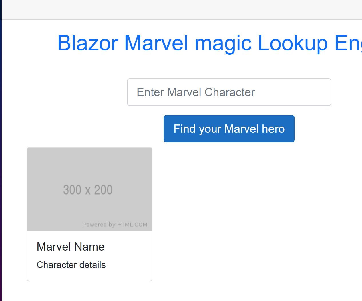 <h1 class="text-center text-primary"> Blazor Marvel Finder</h1>