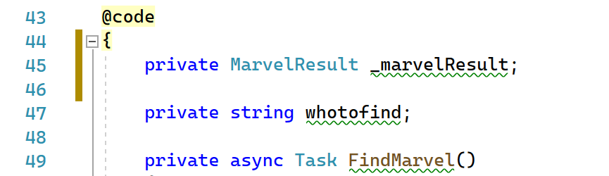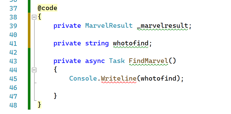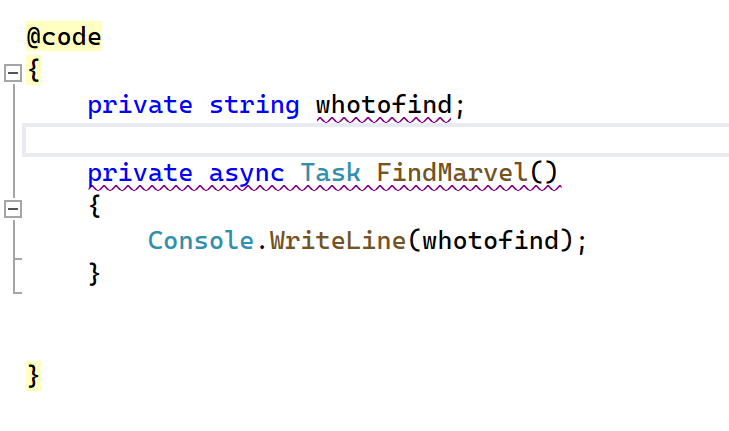 3. Followed by defining a method (task) for the FindMarvel onclick action – for now, let’s write something to the console to validate our search field is working as expected