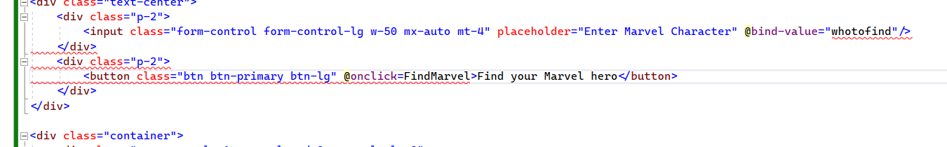 <input class="form-control form-control-lg w-50 mx-auto mt-4" placeholder="Enter Marvel Character" @bind-value="whotofind" />