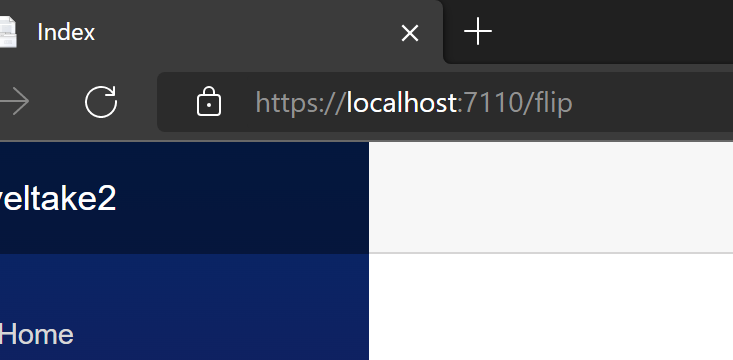 1. When you run the app again, the new Menu item will appear. Given the href=”flip”, it will redirect to the base URL (https://localhost:7110) /flip route