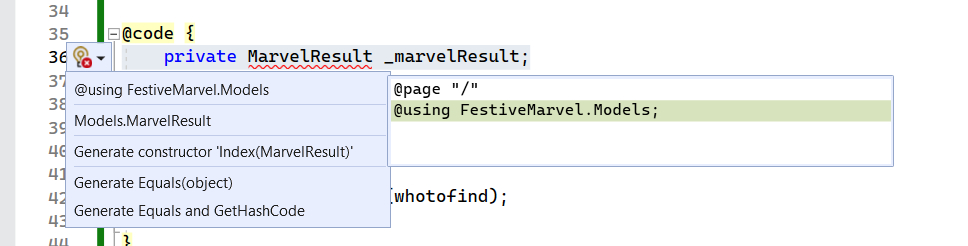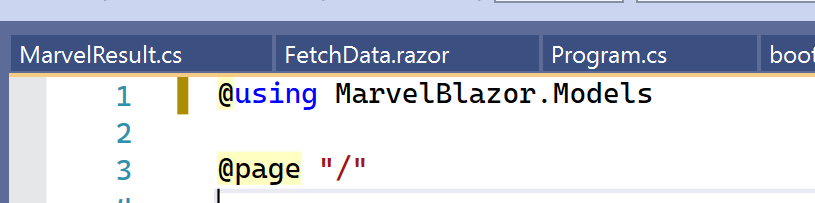 1. and paste this under the @using section and the section of the code you already have (Note: ignore the @using marveltake2.models in the screenshot, it’s the name of my test project)